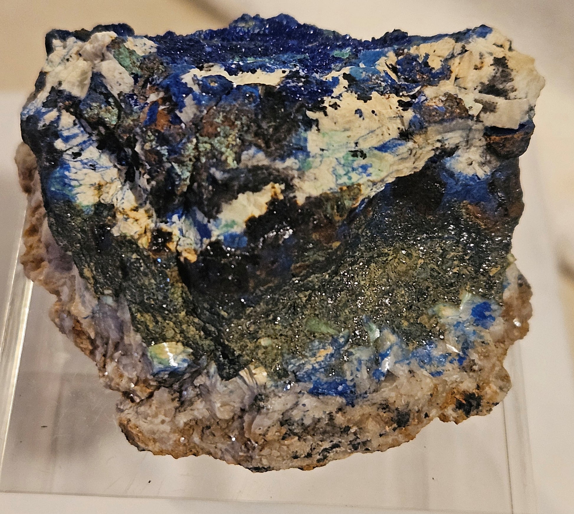 This is a gorgeous association sourced from Morocco with a little bit of everything: large patches of brilliant blue druzy azurite, contrasting patches of bright and deep green Malachite, a whitish Dolomite cluster, and an iron-rich matrix. A stunning find!