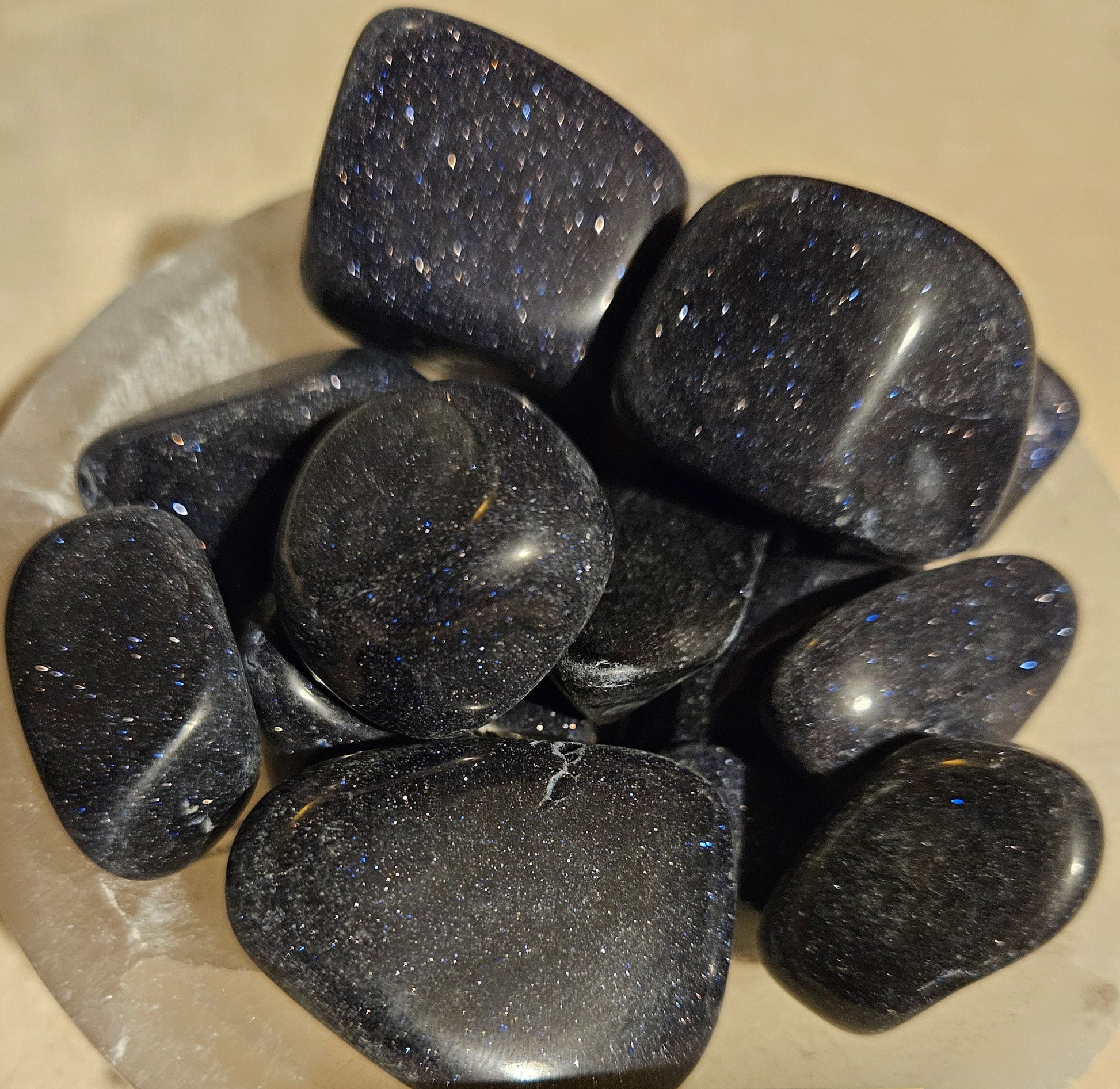Blue Goldstone is a grounding stone that helps ease negative thought