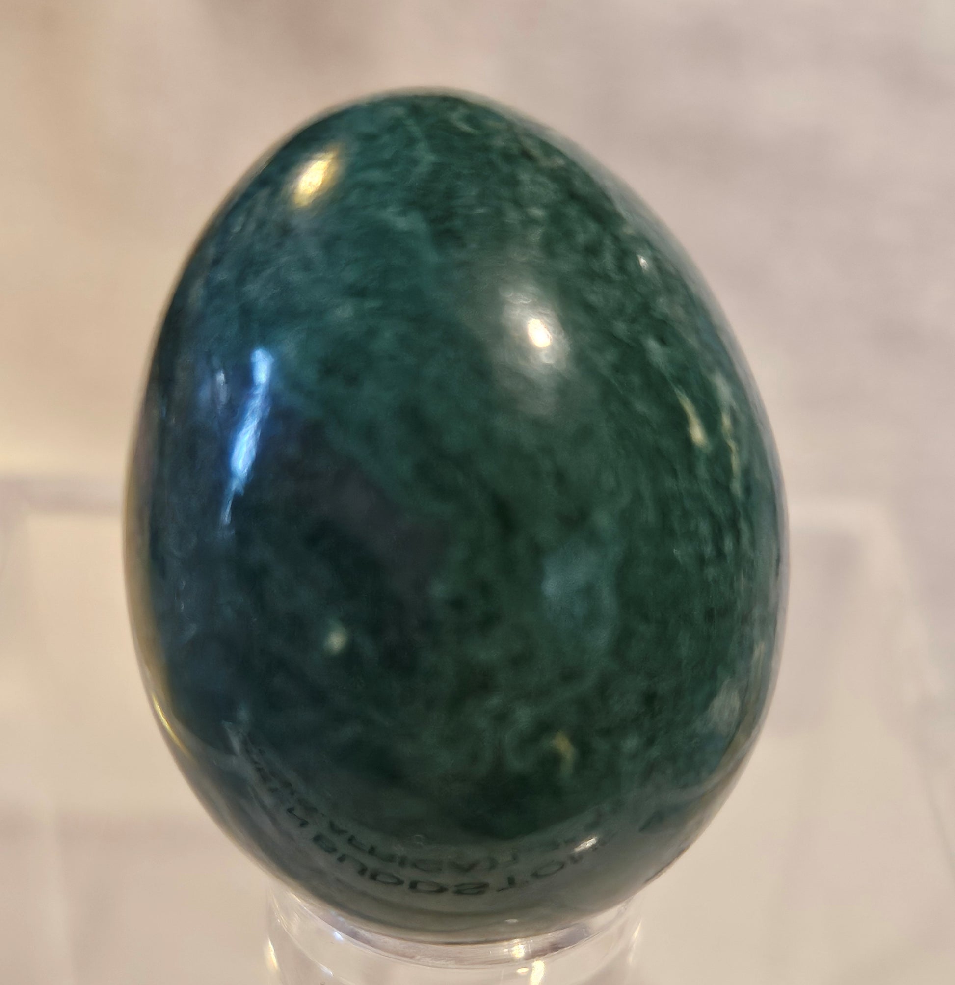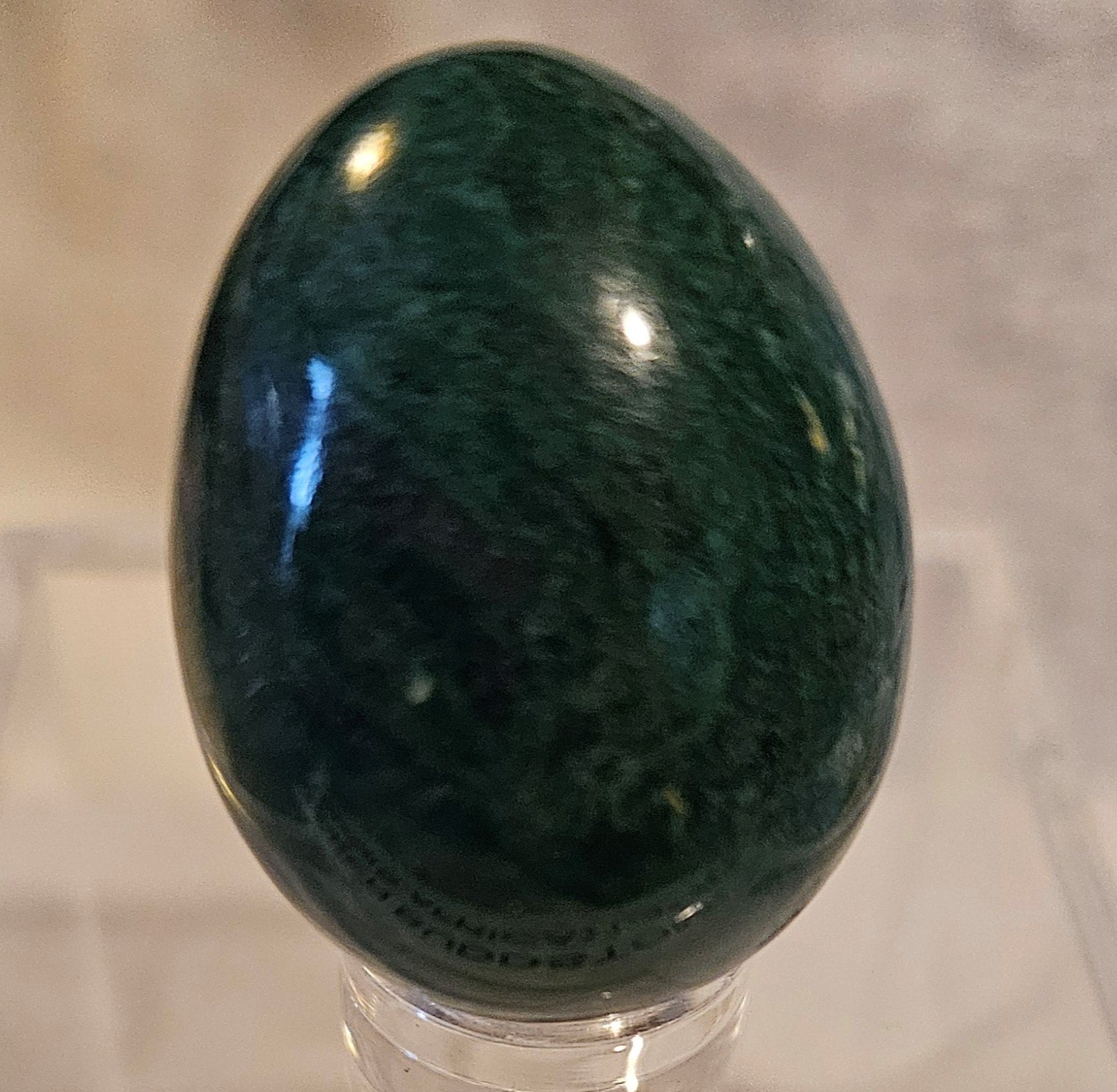 This is a vibrant, 1.4" tall polished egg formed from bright green Buddstone, collected in South Africa. The polish work on this egg is second to none with none of the scuff marks or dull areas like those found on lesser quality material.