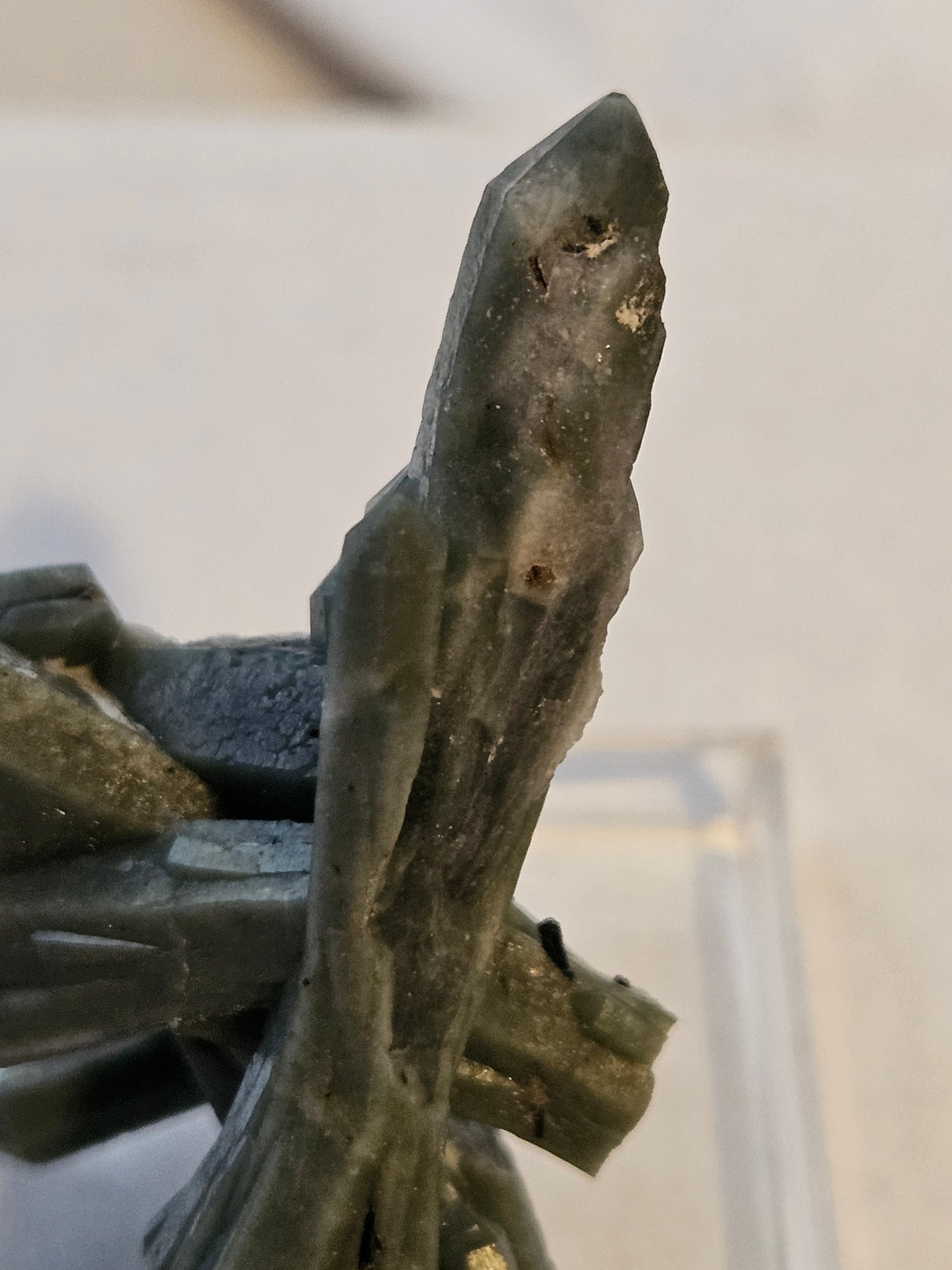 This is a green quartz crystal cluster that was collected from the Huang Gang Mines of Inner Mongolia. The green color of the quartz can be attributed to Hedenbergite inclusions within the quartz.