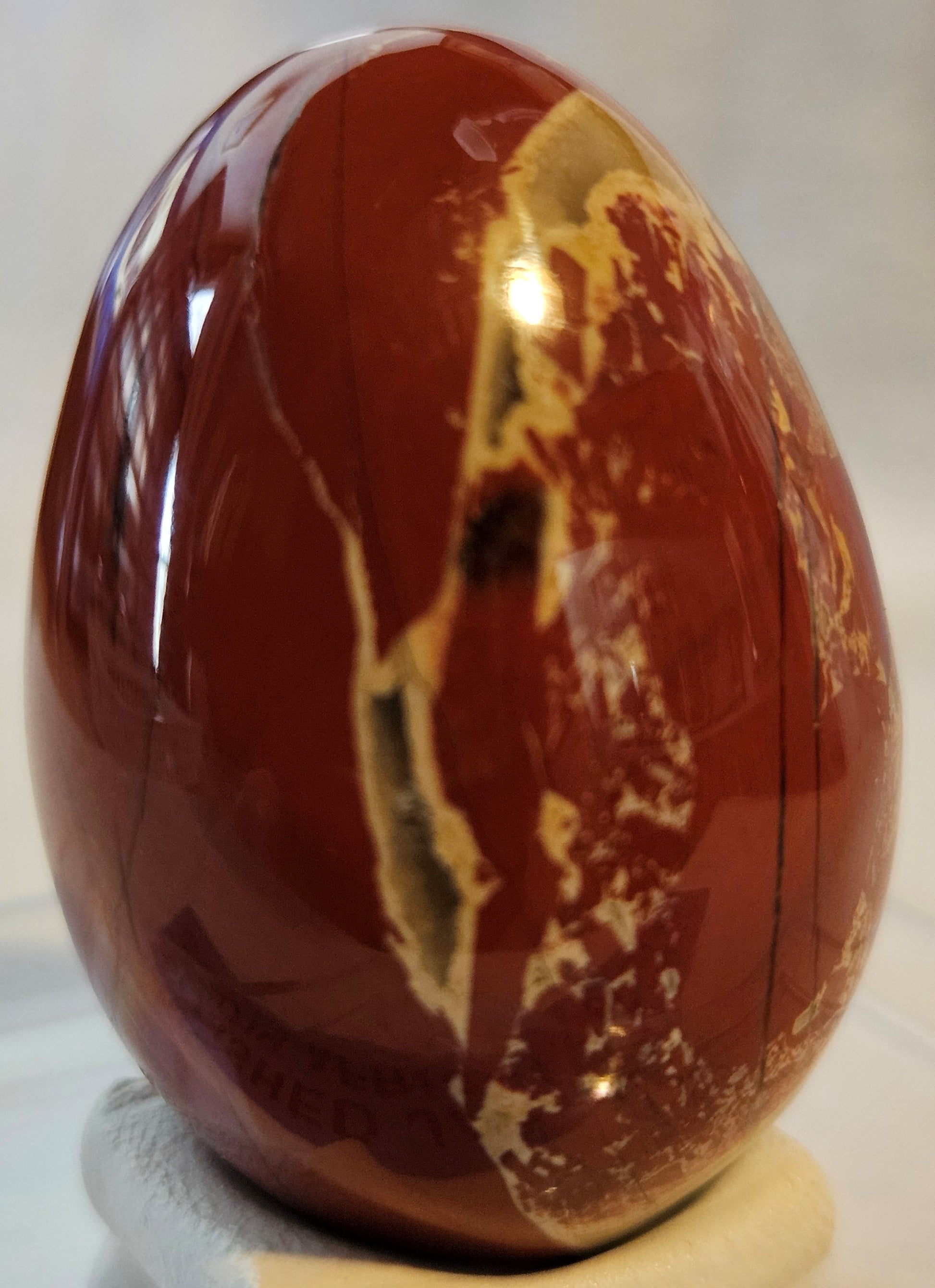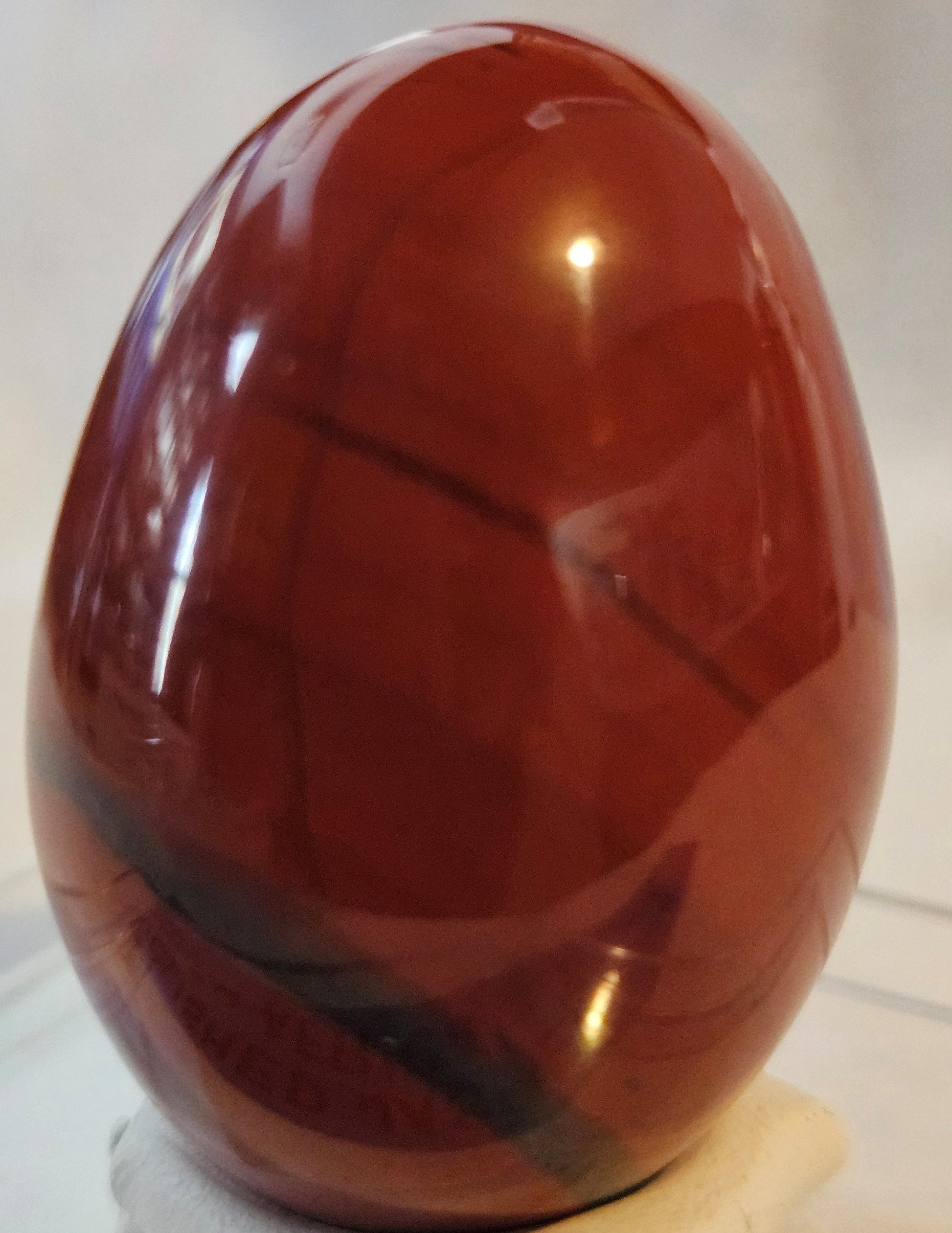 This is a vibrant, 1.35" tall polished egg formed from red jasper with white-blue agate pockets, collected in South Africa. The polish work on this egg is second to none, with none of the scuff marks or dull areas like those found on lesser-quality material.