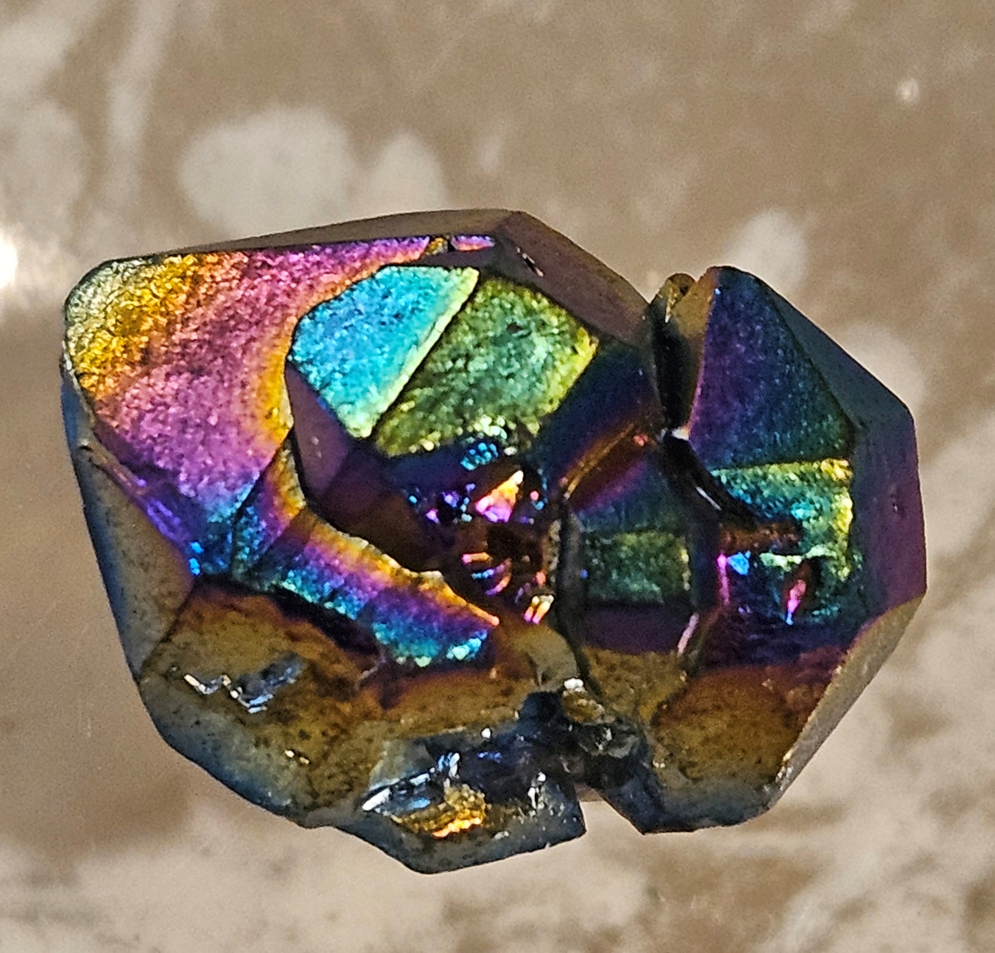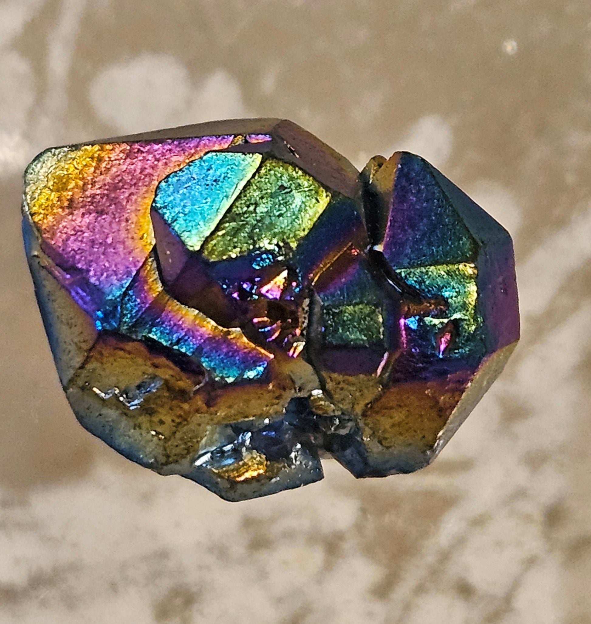 Titanium aura amethyst combines the properties of amethyst with the enhanced energy of titanium bonding, resulting in a stone said to promote emotional balance, spiritual growth, and enhanced aura. Amethyst is known for its calming and protective qualities, while titanium bonding is believed to amplify the stone's energy and ability to clear energetic blockages.