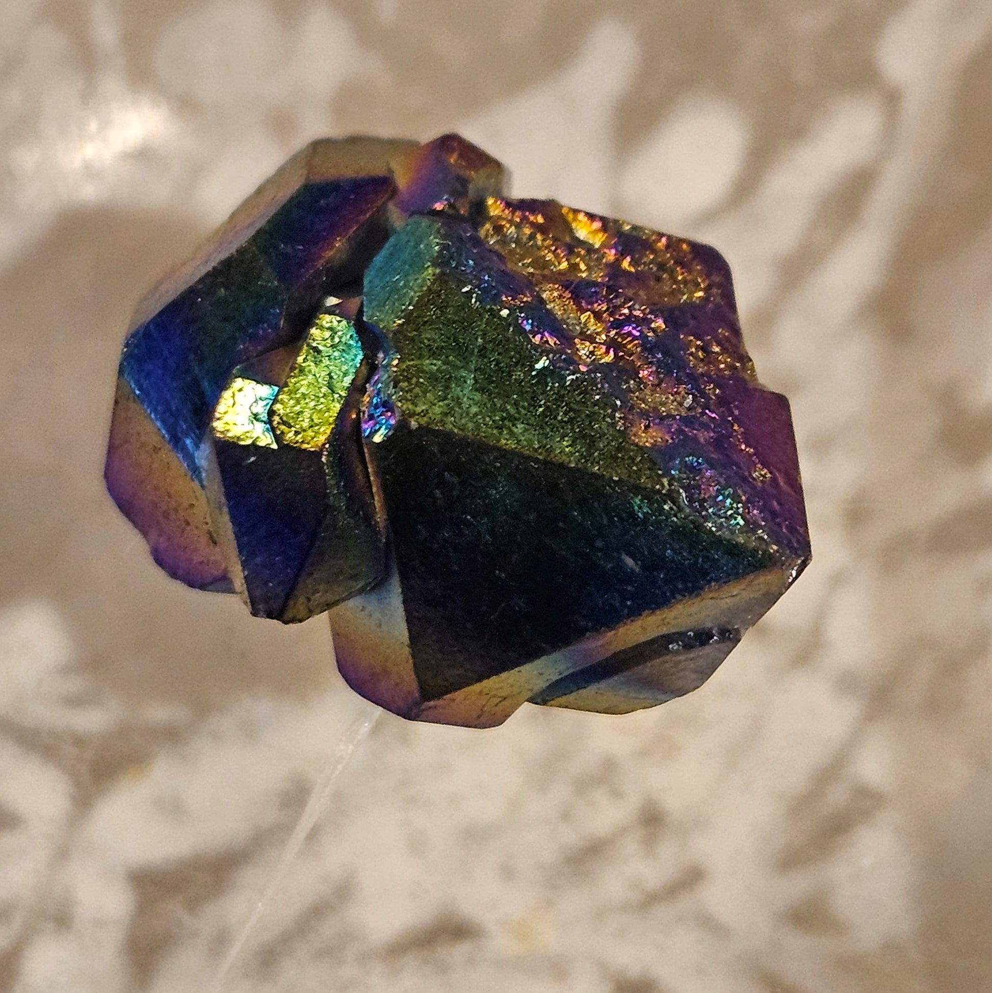 Titanium aura amethyst combines the properties of amethyst with the enhanced energy of titanium bonding, resulting in a stone said to promote emotional balance, spiritual growth, and enhanced aura. Amethyst is known for its calming and protective qualities, while titanium bonding is believed to amplify the stone's energy and ability to clear energetic blockages.
